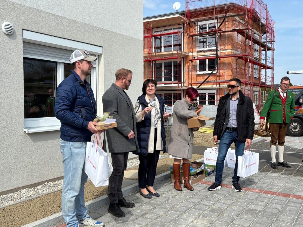 Bei strahlendem Sonnenschein nahmen die neuen Mieterinnen und Mieter ihre Wohnungsschlüssel entgegen. Als traditionelles Einzugsgeschenk überreichte Bürgermeisterin Angela Helm Brot und Salz – ein Symbol für Glück, Wohlstand und einen gelungenen Start im neuen Zuhause.