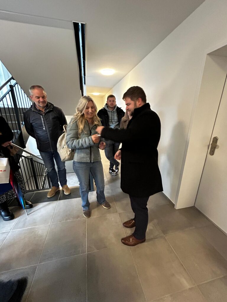 Nach einem kurzen Baubericht durch den Geschäftsführer der GEWOG Neues Heim, DI Bernd Klocker, erfolgte die persönliche Übergabe an die neuen Bewohnerinnen und Bewohner.