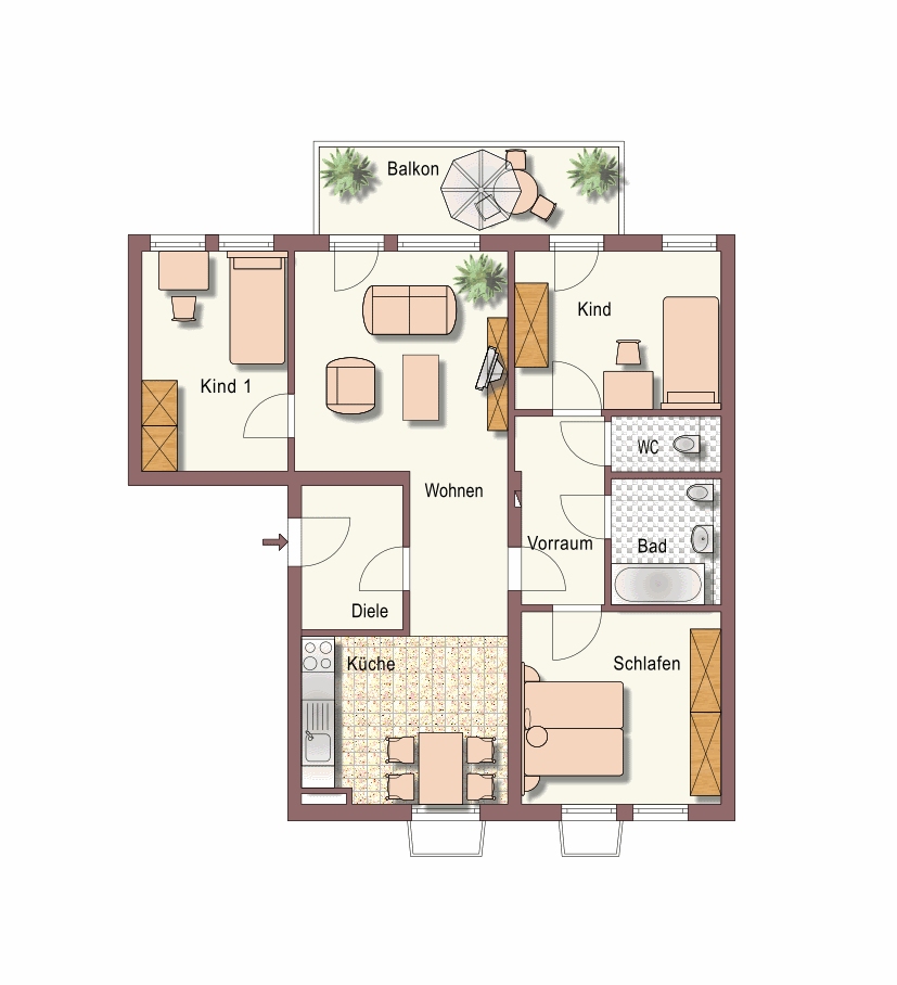 Kinderzimmer, Kinderzimmer, Bad, Balkon, Diele, Kellerabteil, Küche, Schlafzimmer, Tiefgaragenabstellplatz, Vorraum, Vorraum, WC, WohnzimmerStockwerk
