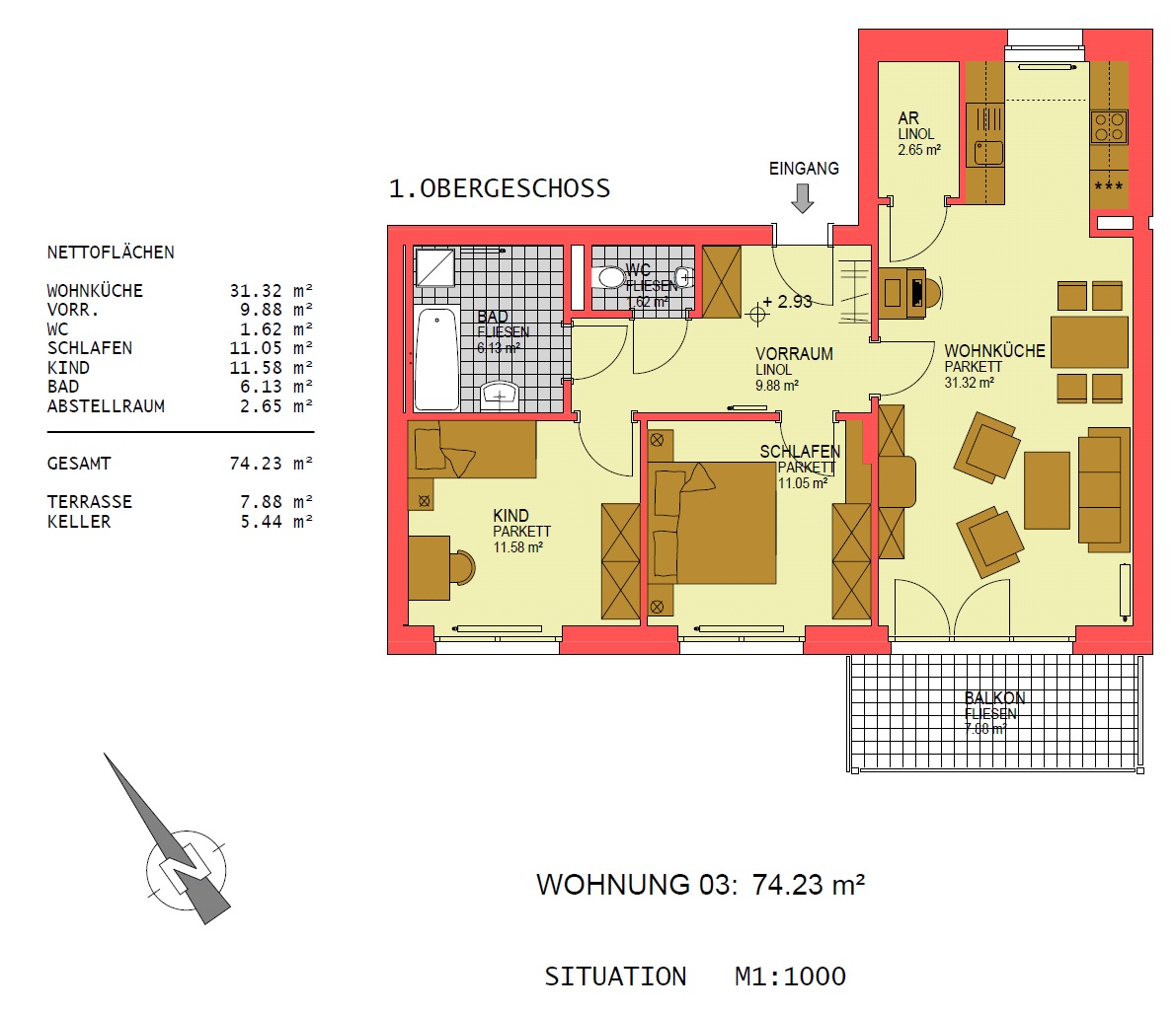Abstellraum, Bad, Balkon, Kellerabteil, Kinderzimmer, Schlafzimmer, Tiefgaragenabstellplatz, Vorraum, WC, Wohnen/Essen/KücheStockwerk