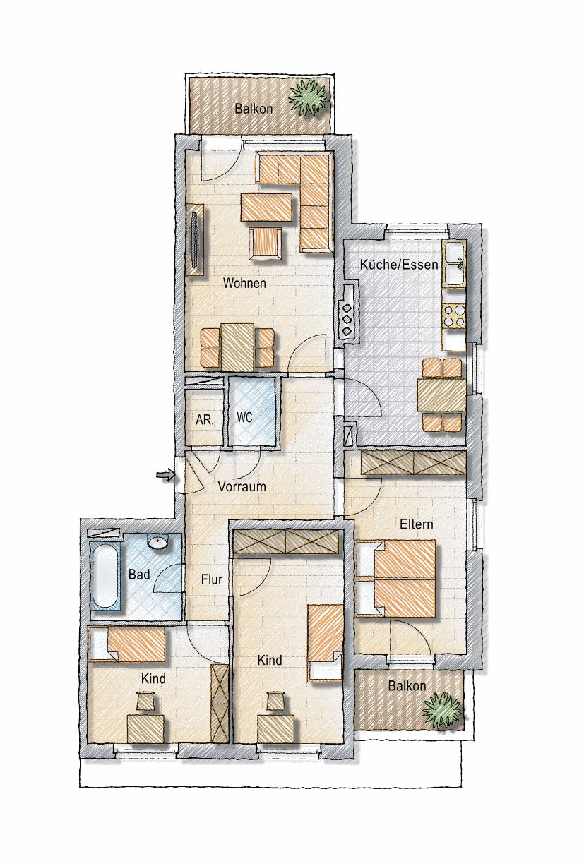 Balkon, Balkon, Kinderzimmer, Kinderzimmer, Abstellraum, Bad, Flur, Garage, Kellerabteil, Kochen+Essen, Schlafzimmer, Vorraum, WC, WohnzimmerStockwerk