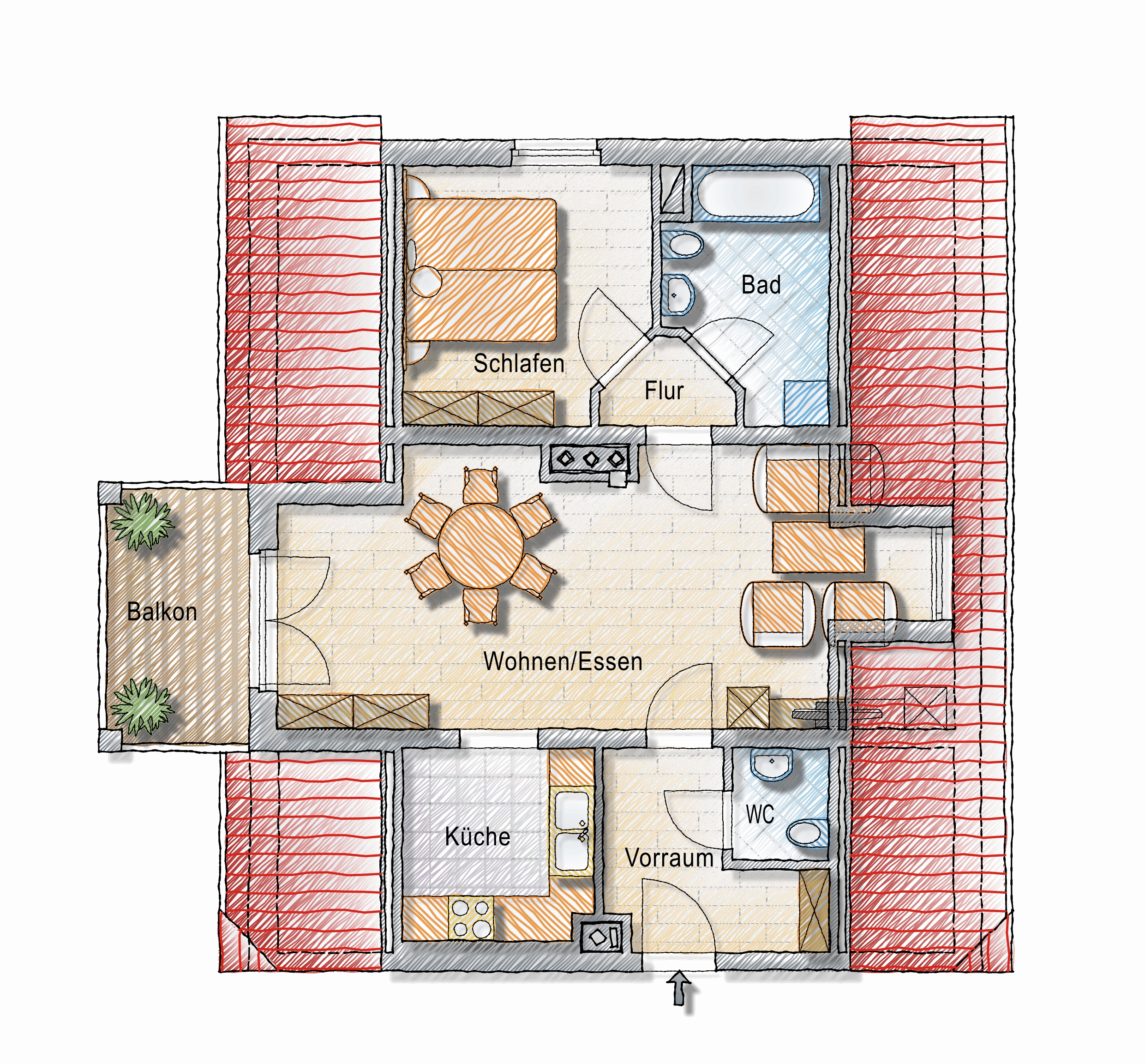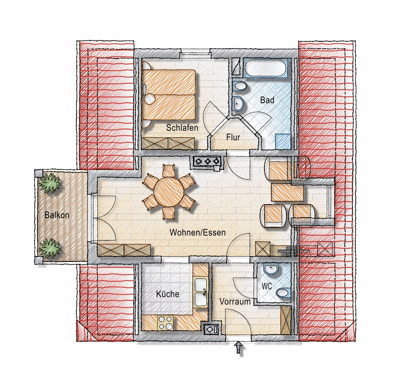 Abstellnische, Bad, Balkon, Garage, Küche, Schlafzimmer, Vorraum, WC, Wohn/EsszimmerStockwerk