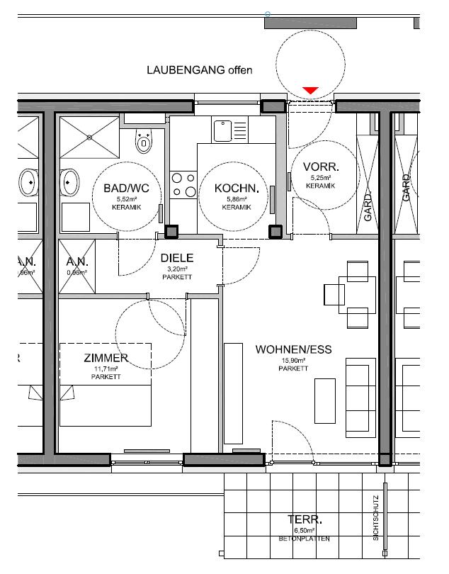Abstellnische, Bad/WC, Diele, Kellerabteil, Lift, Schlafzimmer, Terrasse, Vorraum, Wohnen/Essen/KücheStockwerk