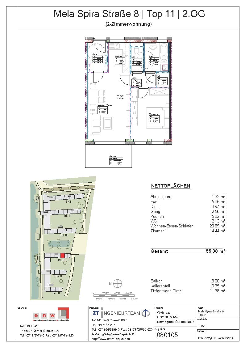 Abstellraum, Bad, Balkon, Diele, Kellerabteil, Küche, Schlafzimmer, Tiefgaragenabstellplatz, WC, Wohn/EsszimmerStockwerk