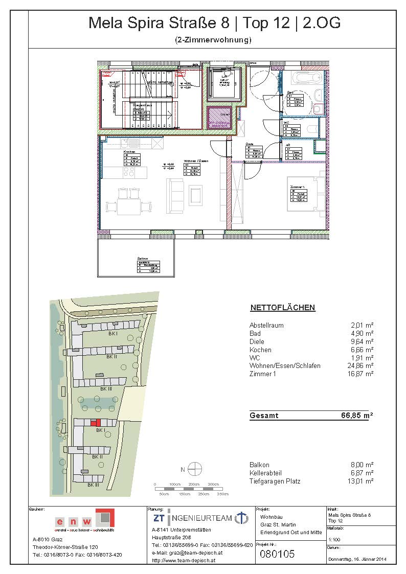 Abstellraum, Bad, Balkon, Diele, Kellerabteil, Tiefgaragenabstellplatz, WC, Wohnen/Essen/KücheStockwerk