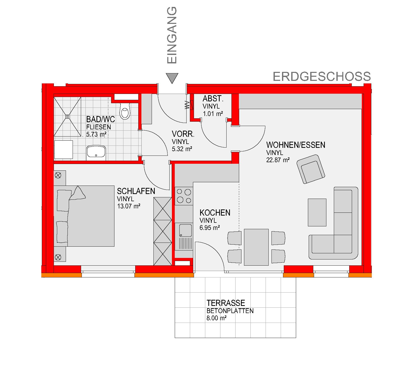 Abstellraum, Bad/WC, Carport, Kellerersatzabteil, Schlafzimmer, Terrasse, Vorraum, Wohnen/Essen/KücheStockwerk