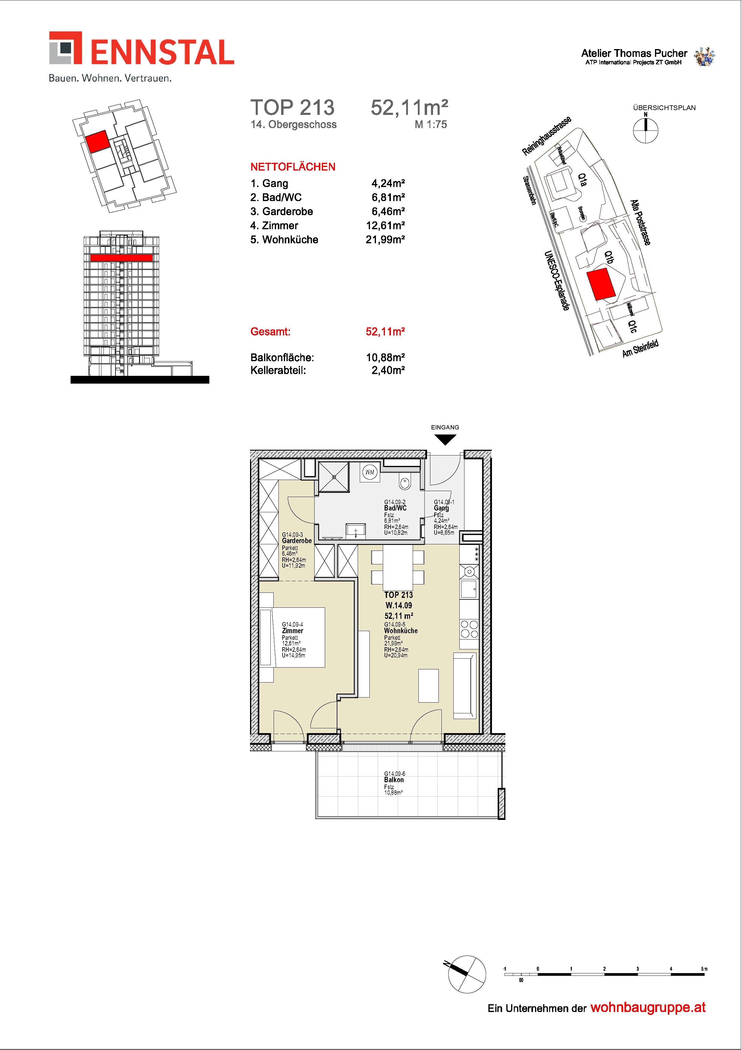 Bad/WC, Balkon, Gang, Garderobe, Kellerabteil, Lift, Schlafzimmer, WohnkücheStockwerk