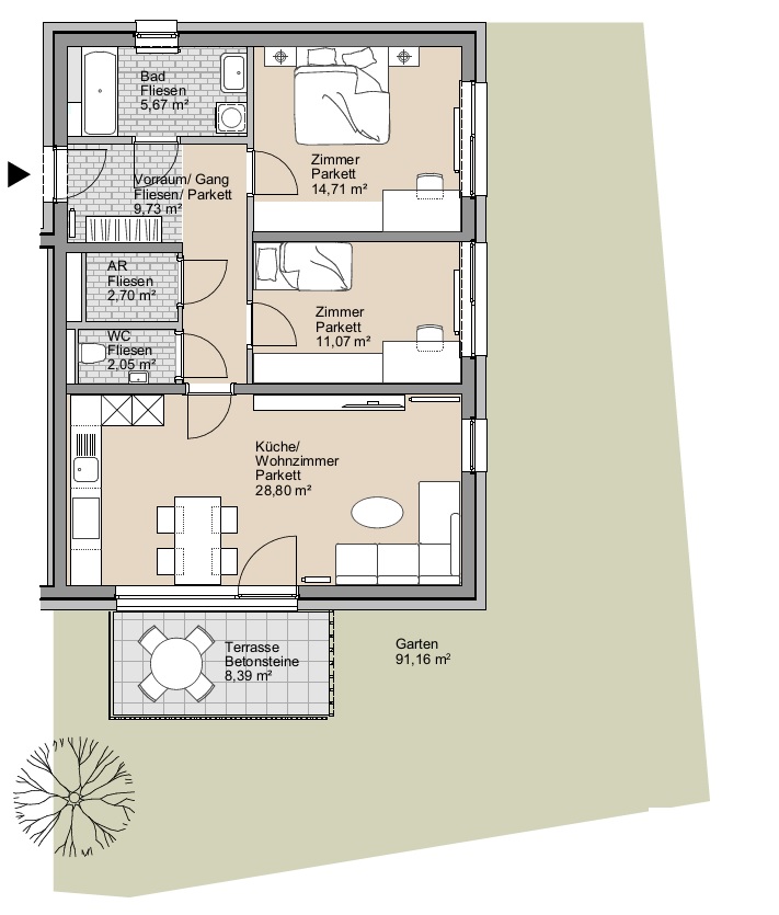Abstellraum, Bad, Gang, Gartenanteil, Kellerabteil, Kinderzimmer, Schlafzimmer, Terrasse, Tiefgaragenabstellplatz, Vorraum, WC, Wohnen/Essen/KücheStockwerk