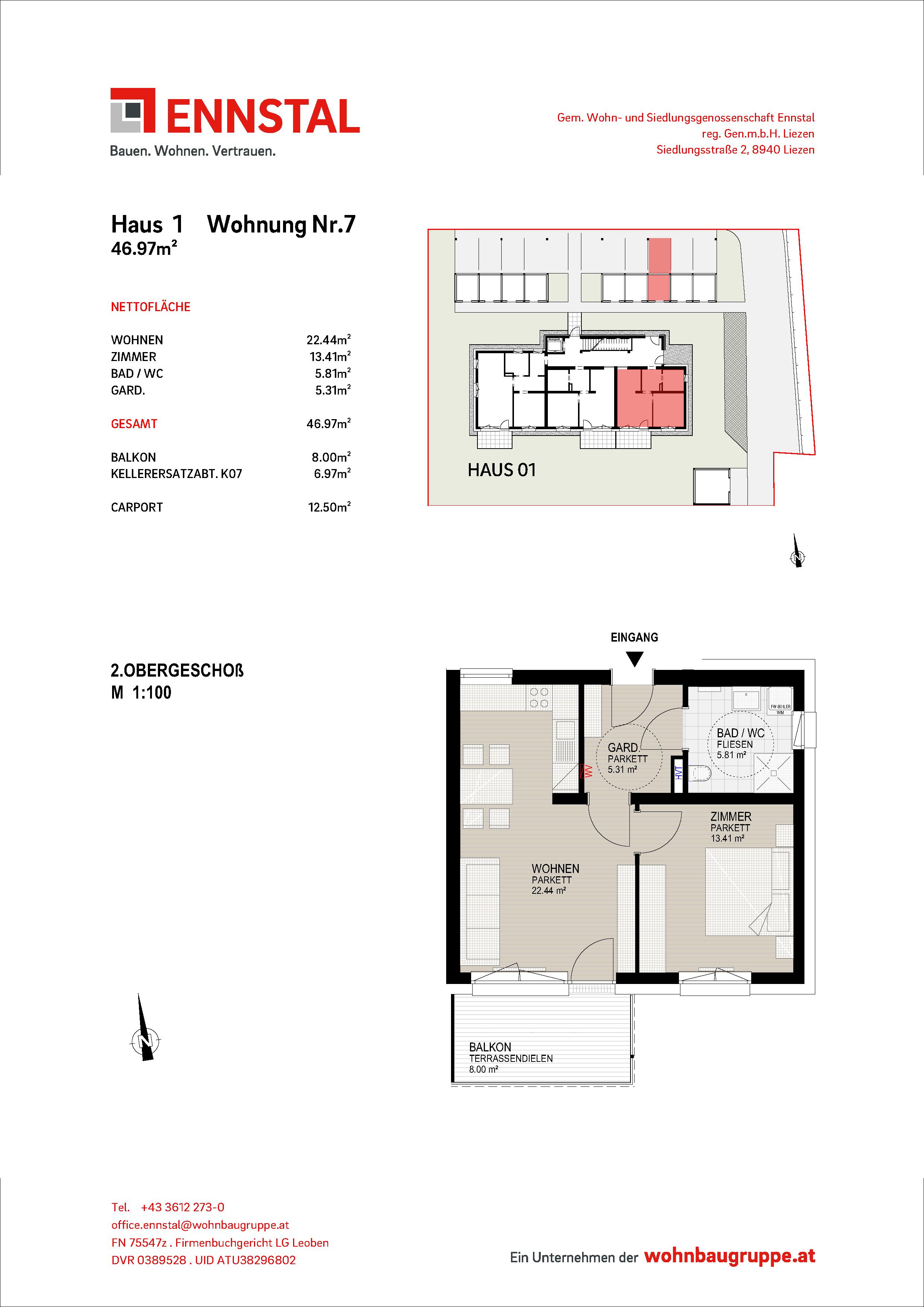 Bad/WC, Balkon, Carport, Garderobe, Kellerersatzabteil, Schlafzimmer, Wohnen/Essen/KücheStockwerk