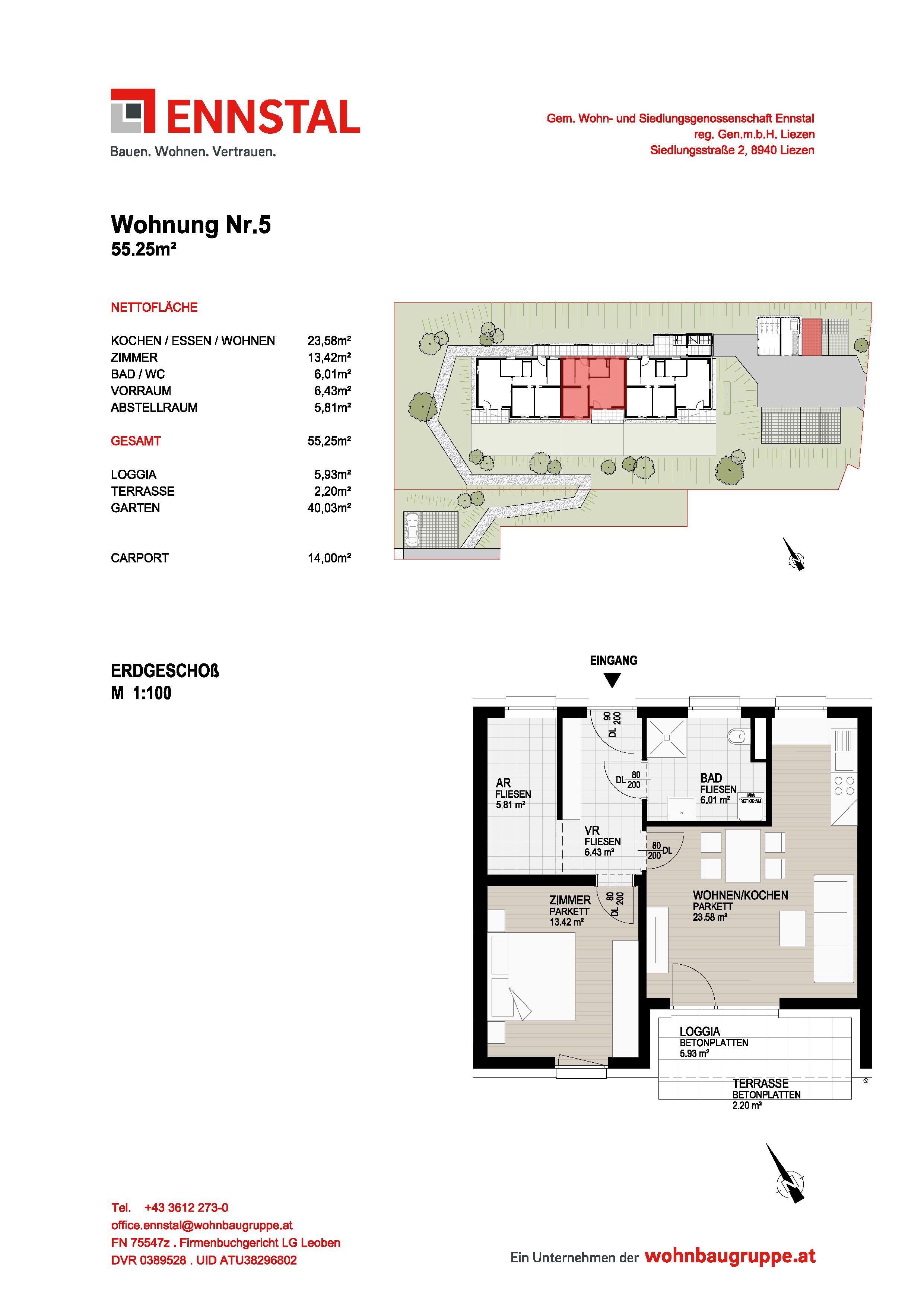 Abstellraum, Bad/WC, Carport, Gartenanteil, Loggia, Schlafzimmer, Terrasse, Vorraum, Wohnen/Essen/KücheStockwerk