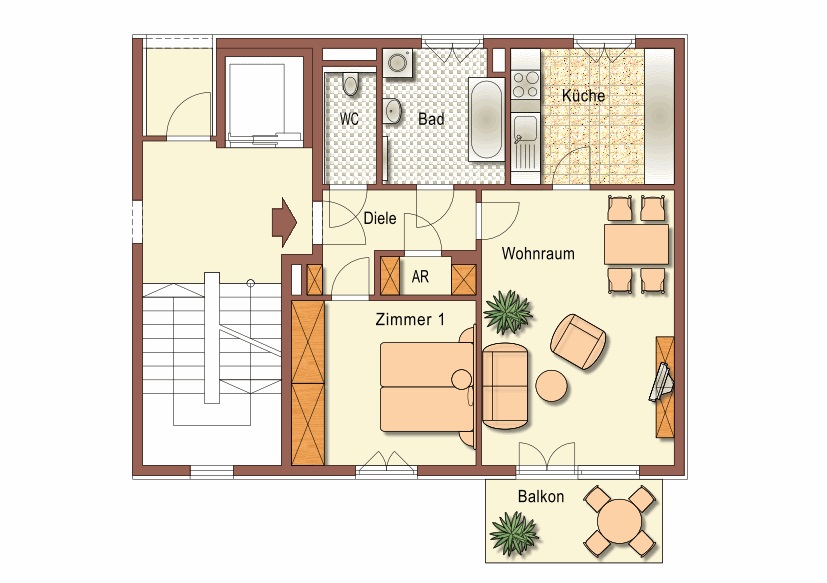 Abstellraum, Bad, Balkon, Diele, Kellerabteil, Küche, Schlafzimmer, WC, Wohn/EsszimmerStockwerk